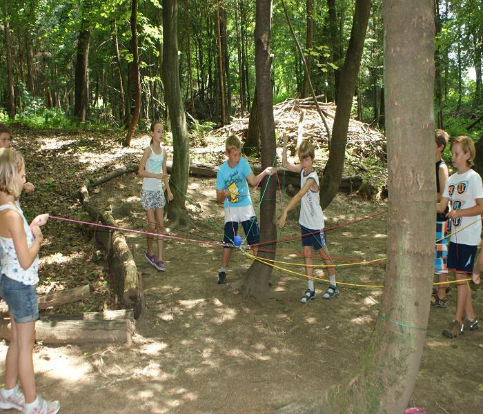 Versuche mit einem Jutesack einen Parcour so schnell wie möglich zu durch hüpfen
