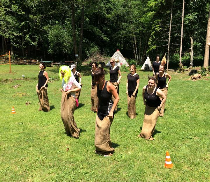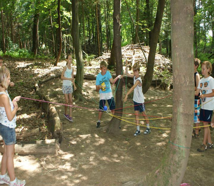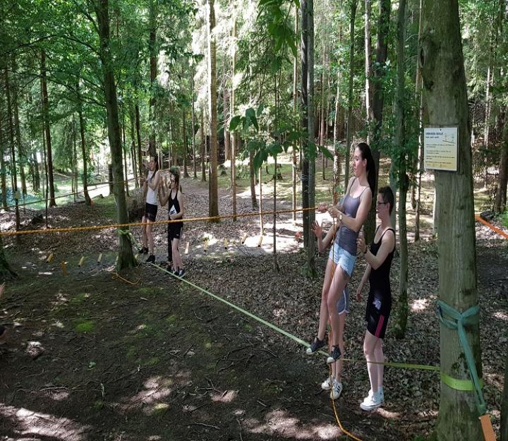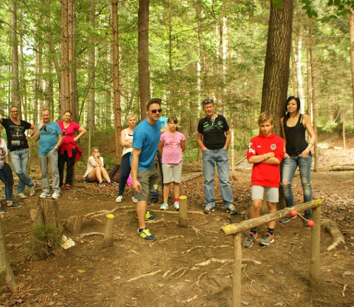 Hängepartie, Balkenpalance, Frisbeekorb, Waldbasketball, Crokettparcour, Riesenmikado, Bodenwurfspiel, Baumwurfspiel.